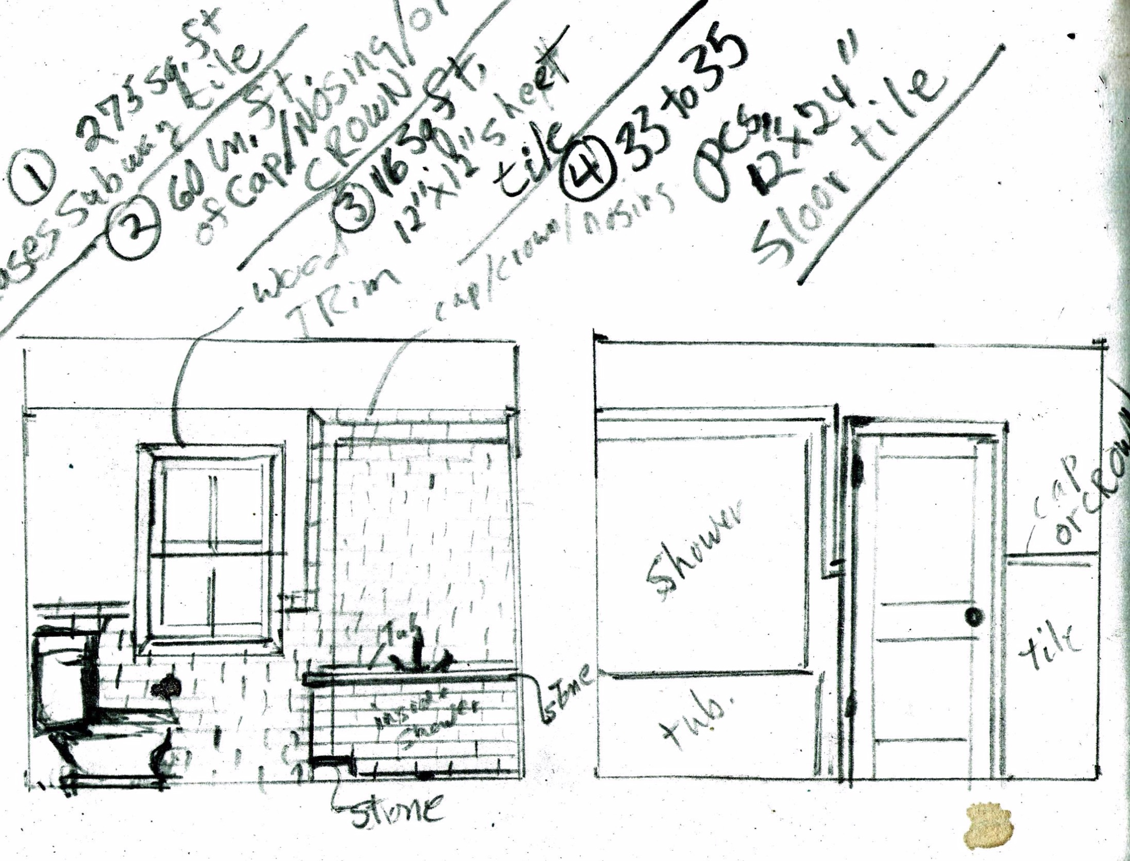 This early blueprint shows the shower and bathtub area. Since farmhouses typically have boxy exteriors, we carry over that boxiness into the bathroom’s layout. No complicated shapes here; everything appears as you would expect it to.