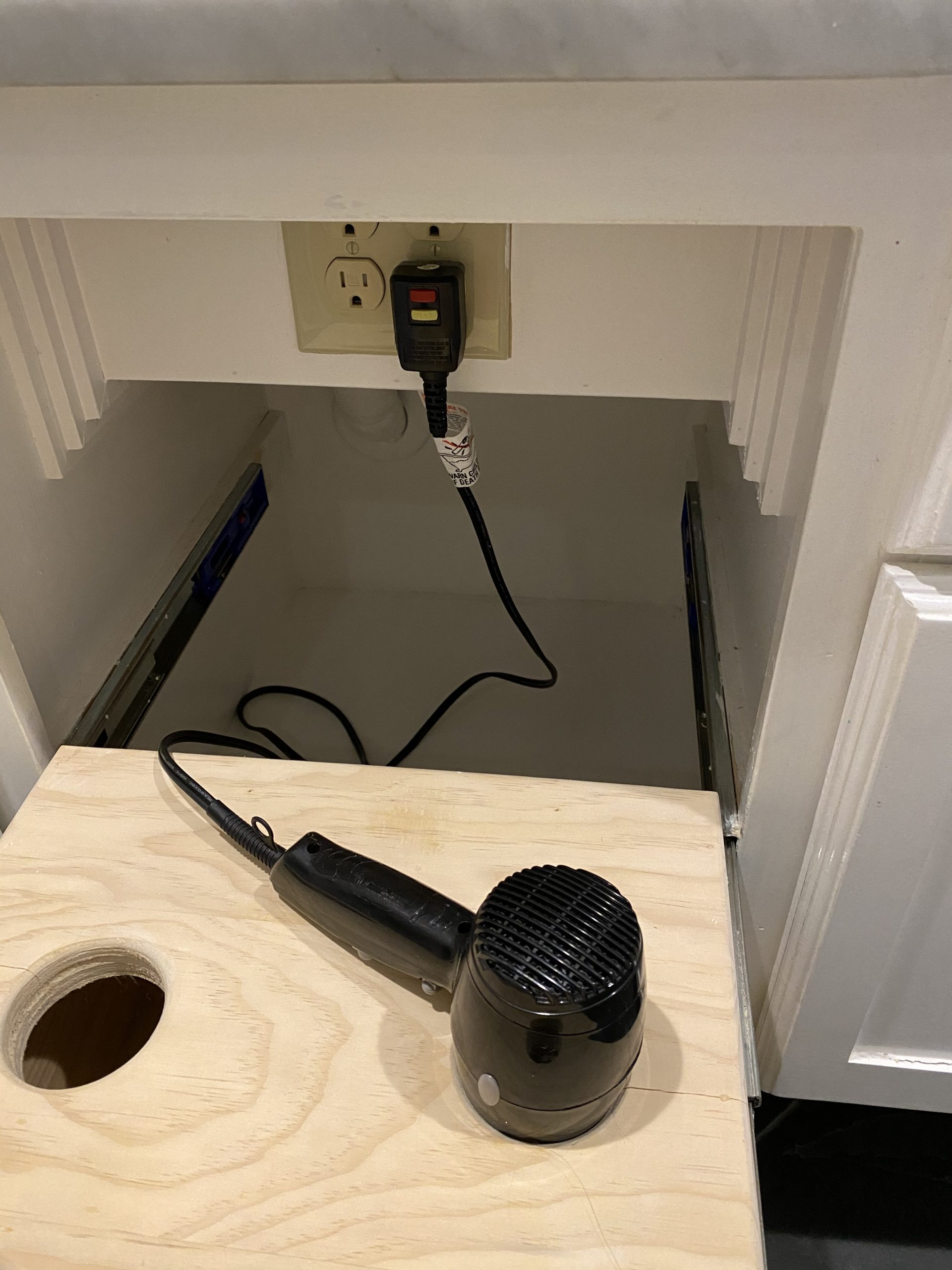 Farmhouse Bathroom Cabinets: Our cabinets are in the Shaker style, but we did add one awesome luxury element that we encourage you to add to your bathroom as well. Open the middle cabinet and you’ll find electrical outlets. Putting the outlet in the cabinet itself is a great way to always keep things such as toothbrush chargers and hair dryers plugged in but off surfaces to create that clutter-free look.
