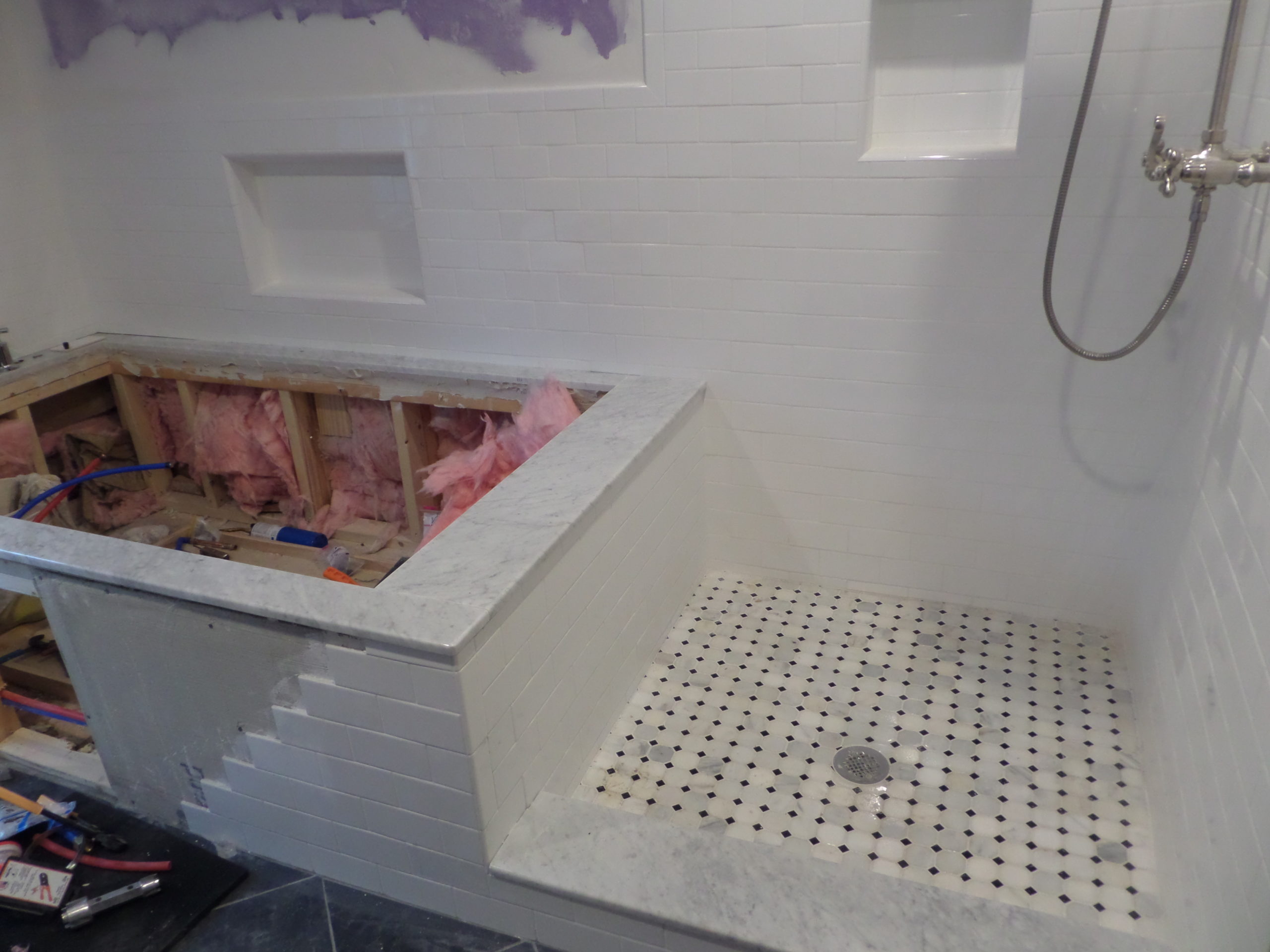 At the highest level, our farmhouse bathroom is defined by the use of the following materials: Carrara marble, stone, subway tile, fiberglass, porcelain, glass, and polished chrome fixtures. We picked all of these elements because they mix together in a classical way but also in a way that is reminiscent of a modern spa. Additionally, all of these materials are relatively easy to source and as such not that expensive, or at the very least much cheaper than sourcing rarer materials sometimes used in bathrooms. Let’s look at each element with a magnifying glass.