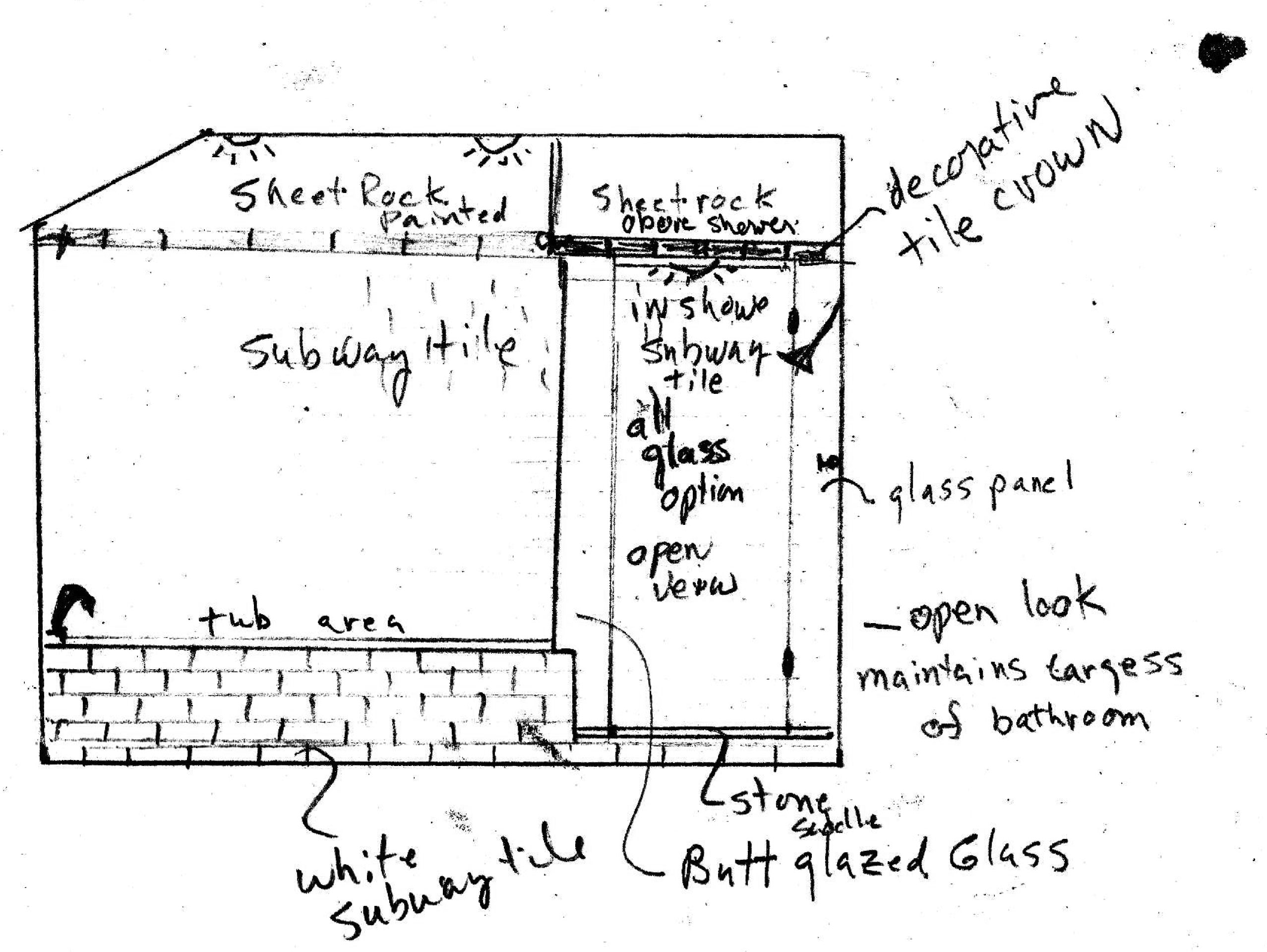 The simplicity is carried over to the vanity area in the early sketches. Simple lines and shapes are the bathroom’s definitive feature. There is little fuss in the design.